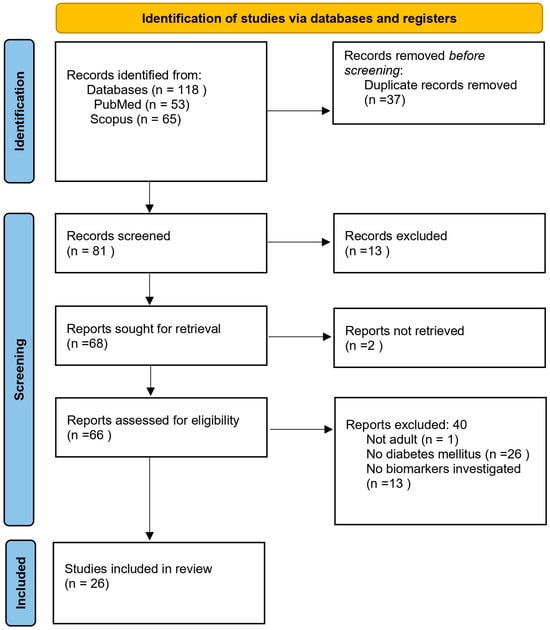 We included original studies published between January 2014 and June 2025 that evaluated tear fluid or ocular surface biomarkers in adult patients (≥18 years) with diabetes mellitus. Exclusion criteria were studies in children or adolescents, non-English publications, reviews, conference abstracts, and studies focusing on ocular surface biomarkers in diseases other than diabetes.
