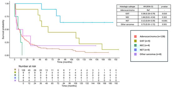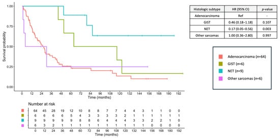 In the non-metastatic cohort, the median OS was 34.10 months (95% CI, 25.40–51.30), with a 2-year OS of 60.7% and a 5-year OS of 36.5%. Stratified by subtype, median OS was 25.39 months (95% CI, 16.43–40.80) for adenocarcinoma, 90.00 months (95% CI, 51.35–NA) for GIST, NR (95% CI, 86.43–NA) for NET, and 17.1 months (95% CI, 2.33–NA) for other sarcomas (Figure 5). Among 64 resected adenocarcinomas, 29 (45.3%) received adjuvant chemotherapy (single-agent 5-FU, n = 14; FOLFOX, n = 7; CAPOX, n = 5; capecitabine monotherapy, n = 3). One patient with GIST (16.7%) received adjuvant imatinib, and one patient with other sarcoma (16.7%) received adjuvant doxorubicin/cyclophosphamide.