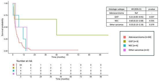 Among patients with metastatic disease, the median OS was 3.02 months (95% CI, 2.30–4.57), with a 2-year OS of 4.7% and a 5-year OS of 3.1%. Within this subgroup, median OS was 2.63 months (95% CI, 1.87–3.94) for adenocarcinoma, 48.06 months (95% CI, 1.91–NA) for GIST, 8.90 months (95% CI, 0.33–NA) for NEC, and 9.28 months (95% CI, 3.02–NA) for other sarcomas (Figure 4). Palliative chemotherapy was administered to 19 patients (29.7%) with synchronous metastatic adenocarcinoma (FOLFOX, n = 8; CAPOX, n = 6; cisplatin/5-FU, n = 1; single-agent 5-FU, n = 4). Three patients with NEC (75.0%) received platinum/etoposide, all two patients with other sarcomas received palliative chemotherapy (doxorubicin/cyclophosphamide, n = 1; single-agent doxorubicin, n = 1), and two patients with metastatic GIST (66.7%) received imatinib.