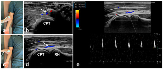 Peak systolic velocity (PSV) measurements of the radial recurrent artery (RRA). (a) Transducer position for short-axis view of the RRA; (b) Short-axis view of the RRA; the white arrow shows the RRA; (c) Transducer position for longitudinal-axis view of the RRA; (d) Longitudinal axis-view of the RRA; the white arrow shows the RRA; (e) Pulse Doppler sonograms of the RRA. PSV, peak systolic velocity; RRA, radial recurrent artery. CPT, capitellum of the humerus; RH, radial head.