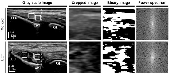 Fiber orientation measurements of the common extensor tendon on the lateral epicondyle. White dotted lines indicate the region of interest. White squares indicate the cropped area. LET, lateral elbow tendinopathy; LEC, lateral epicondyle; CPT, capitellum of the humerus; RH, radial head; Lat, lateral; Dist, distal.