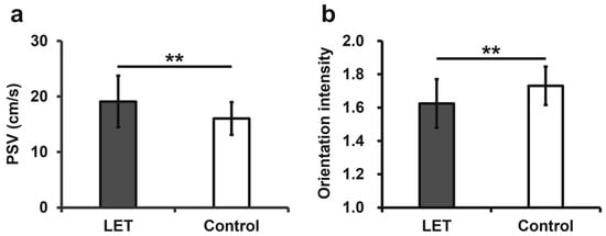 The results for the PSV of the RRA and the fiber orientation intensity are shown in Figure 3. The mean PSV of the RRA was 19.10 ± 4.63 cm/s in the LET group and 16.04 ± 2.96 cm/s in the control group. The PSV of the RRA was significantly higher in the LET group than in the control group (p < 0.01). The mean fiber orientation intensity was 1.62 ± 0.15 and 1.73 ± 0.12 in the LET and control groups, respectively. The fiber orientation intensity was significantly lower in the LET group than in the control group (p < 0.01).