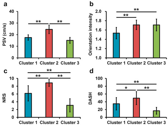 Ultrasonographic assessments and patient-reported outcome measures in each cluster. (a) Comparison of PSV among clusters. (b) Comparison of fiber orientation intensity among clusters. (c) Comparison of NRS among clusters. (d) Comparison of DASH among clusters. PSV, peak systolic velocity; NRS, numerical rating scale; DASH, Disability of the Arm, Shoulder, and Hand; * p < 0.05; ** p < 0.01.