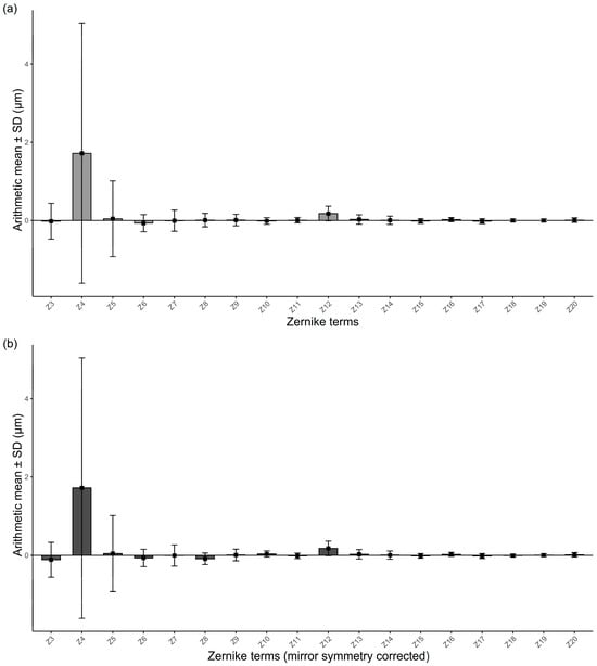 Mean Zernike coefficients at a 6 mm pupil diameter without (a) and with (b) mirror symmetry correction. Error bars represent ±1 SD. Correction applied to asymmetric terms (Z3, Z8–Z11, and Z18–Z20). Zernike terms are labeled as follows: Z3, oblique astigmatism; Z4, defocus; Z5, vertical astigmatism; Z6, vertical trefoil; Z7, vertical coma; Z8, horizontal coma; Z9, oblique trefoil; Z10, oblique quadrafoil; Z11, oblique secondary astigmatism; Z12, spherical aberration; Z13, vertical secondary astigmatism; Z14, vertical quadrafoil; Z15, vertical pentafoil; Z16, vertical secondary trefoil; Z17, vertical secondary coma; Z18, horizontal secondary coma; Z19, oblique secondary trefoil; Z20, oblique pentafoil. SD = standard deviation.