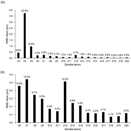 Consistent with the results of Thibos et al., most Zernike coefficients, except defocus (Z4) and SA (Z12), were close to zero, regardless of mirror symmetry correction, indicating the tendency of opposing signs to cancel out across individuals [13,15,18]. Defocus (Z4) and SA (Z12) were biased toward positive values. Accordingly, absolute or RMS values were applied for evaluating the magnitude accurately, as adopted in previous studies. With a 6 mm pupil size, vertical coma (Z7) and SA (Z12) contributed most to HOA RMS (15.2% and 14.4%, respectively; Figure 2b). Along with prior studies, the relative contribution of each Zernike term decreased with increasing order [14,16], supporting the comparability of our fifth-order analysis with previous investigations.