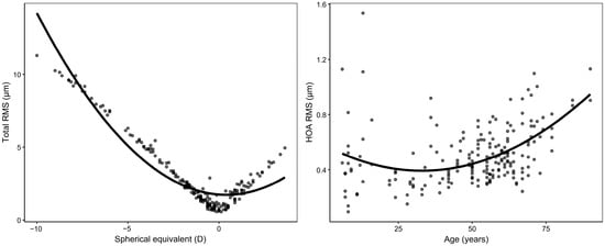 Quadratic associations between total RMS and SE (left) and between HOA RMS and age (right), at a 6 mm pupil diameter. Dots represent individual eyes, and solid lines represent fitted second-order polynomial regression curves. Regression shows a U-shaped relationship between SE and total RMS (R2 = 0.899, p < 0.001) and a nonlinear increase in HOA RMS with age (R2 = 0.207, p < 0.001). SE = spherical equivalent.