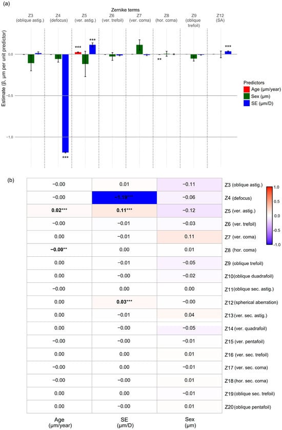 Multivariable associations of Zernike coefficients with age, SE, and sex, at a 6 mm pupil diameter. (a) Grouped bar plot of β coefficients (±standard error) from linear mixed-effects models for selected terms (Z3–Z9, Z12). (b) Heatmap summarizing estimates for all terms (Z3–Z20). Separate models were fitted for each Zernike coefficient with age, SE, and sex as fixed effects and a random intercept per subject. Mirror symmetry correction was applied to asymmetric terms (Z3, Z8–Z11, Z18–Z20). p-values were adjusted using Bonferroni correction for multiple testing across Zernike terms. β = regression coefficient from linear mixed-effects model; sex (M) = male, female sex as reference; ver. = vertical; astig. = astigmatism; hor. = horizontal; sec. = secondary; statistical significance after Bonferroni correction: *** p < 0.001; ** p < 0.01.