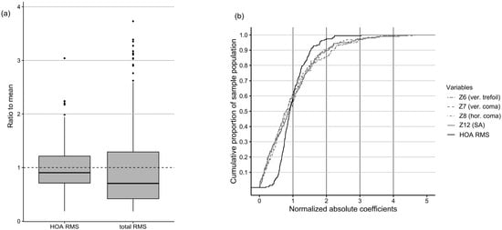 To allow the assessment of interindividual variability and enhance the interpretability of the results, total RMS and HOA RMS values were normalized by dividing these values by the population mean. Figure 5a presents the distributions of normalized RMS values. HOA RMS showed a narrower IQR and fewer outliers (n = 6) compared to total RMS (n = 16), suggesting that HOA RMS may serve as a more stable population reference than total RMS. Figure 5b shows the cumulative distribution functions of normalized HOA RMS and selected Zernike coefficients (Z6, Z7, Z8, and Z12), which demonstrated relatively high contributions to HOA RMS. Over 95% of eyes exhibited HOA RMS values within twice the population mean. Similarly, approximately 55–60% of eyes showed Z6, Z7, Z8, and Z12 values within their respective means, and 85–90% within twice the mean for each term.