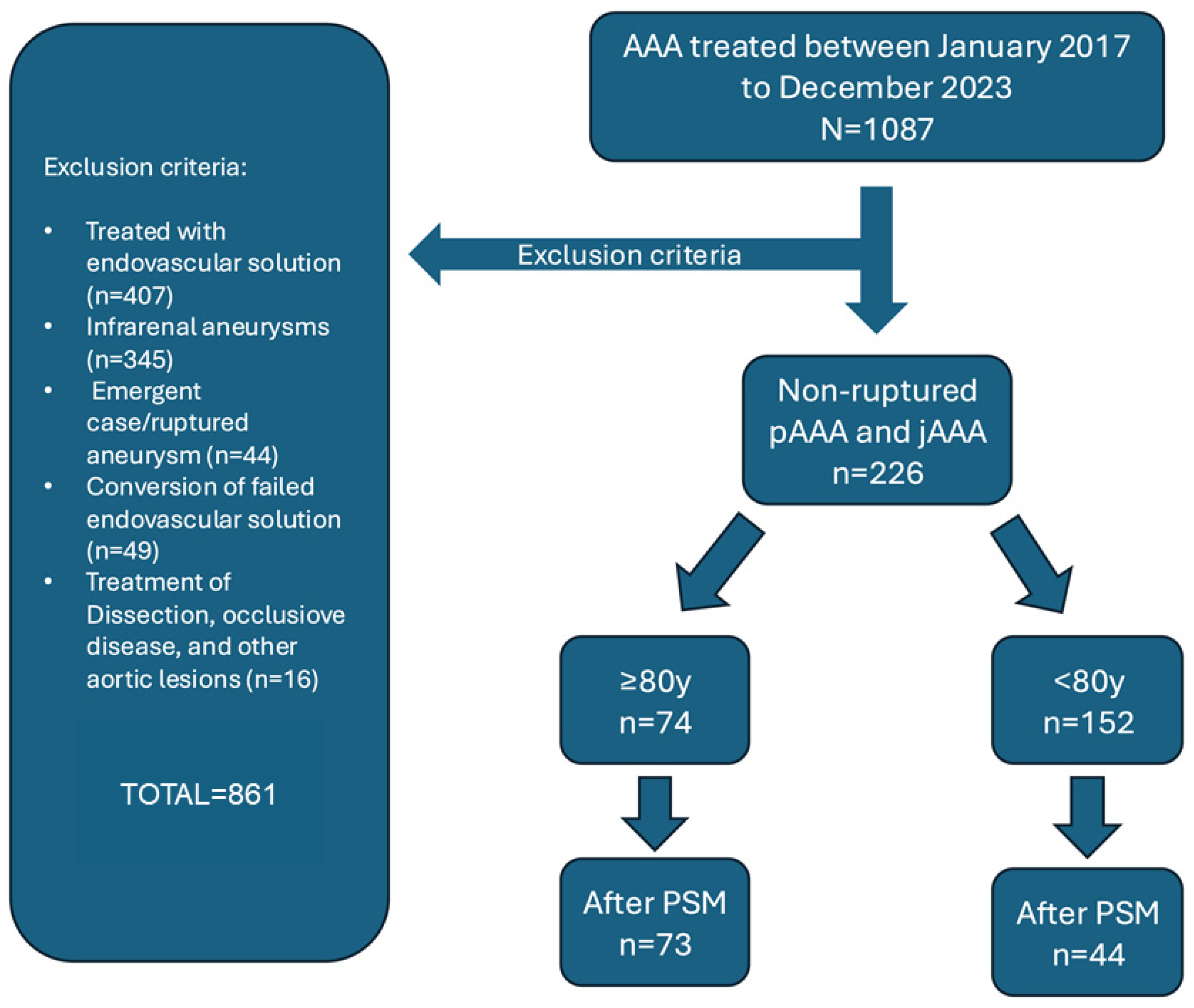 34]. To address this issue, we compared outcomes of patients ≥ 80 vs. <80 years undergoing open repair for cAAA. A propensity score-matched analysis was performed to assess the impact of age on short- and mid-term mortality and morbidity, aiming to support informed clinical decision-making in this complex population.