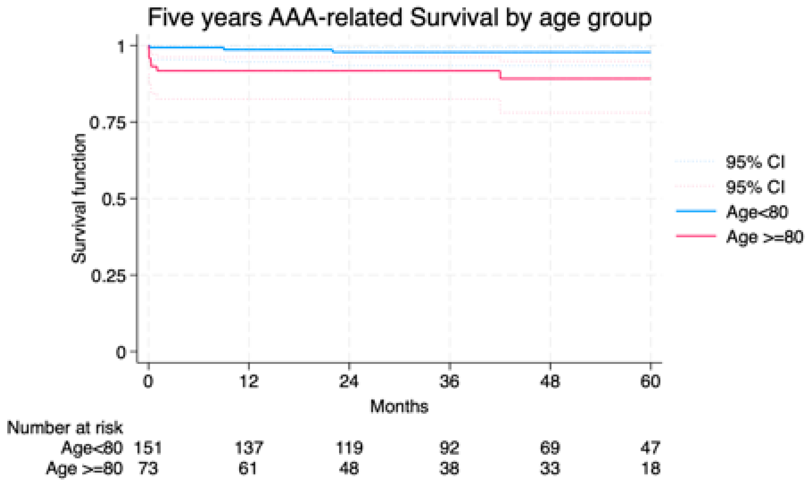 3]., who reported similar technical success and complication rates across age groups for F/BEVAR, but with lower long-term survival in elderly patients due to competing risks. Our results suggest that, in selected octogenarians with a life expectancy of ≥5 years, OSR can achieve durable aneurysm exclusion comparable to younger patients.