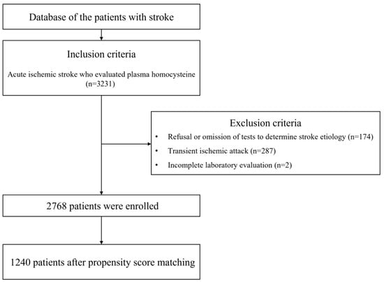 Ischemic stroke is diagnosed based on clinical features consistent with focal cerebral ischemia and supported by imaging evidence of corresponding lesions on diffusion-weighted magnetic resonance imaging (DWI) with related low signal intensity on the apparent diffusion coefficient. These findings are assessed together with a compatible clinical history and neurological findings. Similarly, recurrent stroke is characterized as the development of a new acute neurologic deficit of vascular origin or the significant worsening of a pre-existing deficit not attributable to a brain shift, edema, hemorrhagic transformation, concurrent illness, hypoxia, or drug toxicity. Such recurrence requires confirmation via neuroimaging that demonstrates recent infarction occurring at least 24 h after the onset of the index event [26]. Patients were included in this study if they experienced an ischemic stroke and had documented plasma homocysteine levels at the time of discharge between March 2014 and December 2021. They were excluded if they had a transient ischemic attack, intracranial hemorrhage, subarachnoid hemorrhage, or subdural hematoma; they were unable to undergo magnetic resonance imaging (MRI); or they refused to participate in diagnostic tests to determine stroke etiology, with incomplete laboratory evaluations.