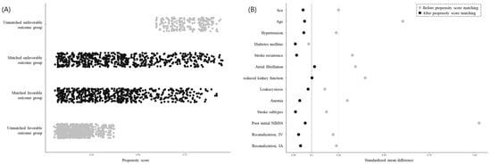 Propensity score matching (PSM) analysis was conducted to validate our findings after controlling for potential confounders. PSM was performed to balance the baseline characteristics between the groups with favorable and unfavorable outcomes. One-to-one nearest-neighbor matching without replacement was applied using a caliper width of 0.25 times the standard deviation of the propensity score’s logit. Covariate balance after matching was assessed using the standardized mean difference (SMD), where an absolute SMD value of <0.1 indicates an acceptable balance. Propensity scores were derived from a multivariable logistic regression model that incorporated the following covariates: age, sex, hypertension, diabetes mellitus, atrial fibrillation, reduced kidney function, leukocytosis, anemia, recurrent stroke, stroke subtypes, poor initial NIHSS, and recanalization therapy.