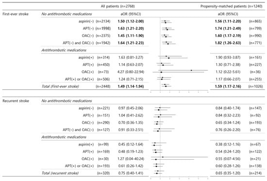 After stroke recurrence was stratified, the relationship between no antithrombotic medication pre-stroke and unfavorable outcomes remained significant in patients who underwent their first-ever stroke (no aspirin, aOR 1.50–1.56; no APT, aOR 1.63–1.74; no OAC, aOR 1.45–1.60; no APT and no OAC, aOR 1.64–1.82) before and after PSM. Among the patients using pre-stroke antithrombotic medications, hyperhomocysteinemia was not related to unfavorable clinical outcomes regardless of first-ever or recurrent stroke events (Figure 3).
