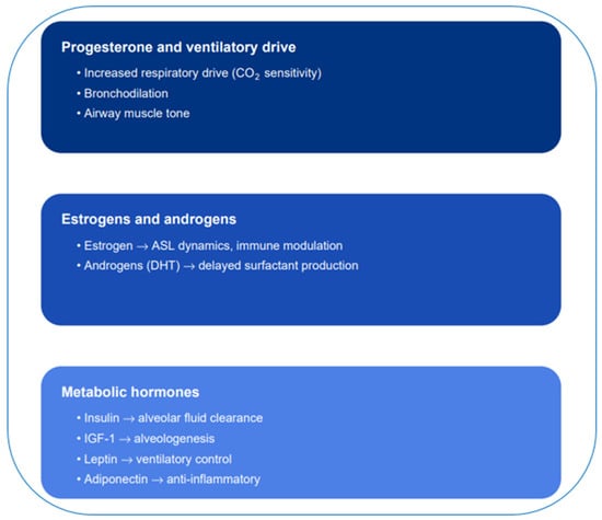 Systemic hormones play a pivotal role in pulmonary development and function. Thyroid hormones are essential for alveolar maturation and surfactant synthesis [1], while glucocorticoids drive fetal lung maturation and support antenatal steroid therapy [2,3,4]. Sex steroids influence bronchial tone, ventilatory drive, and inflammatory responses [5,6,7,8,9,10,11], contributing to sex differences in asthma and chronic obstructive pulmonary disease (COPD) [12,13]. Metabolic hormones such as insulin, leptin, and IGF-1 also modulate pulmonary mechanics and immune function. Consequently, endocrine disorders including hypothyroidism [14], diabetes mellitus [15,16], acromegaly [15,17], and obesity [18] often manifest with pulmonary alterations, ranging from hypoventilation to obstructive sleep apnea.