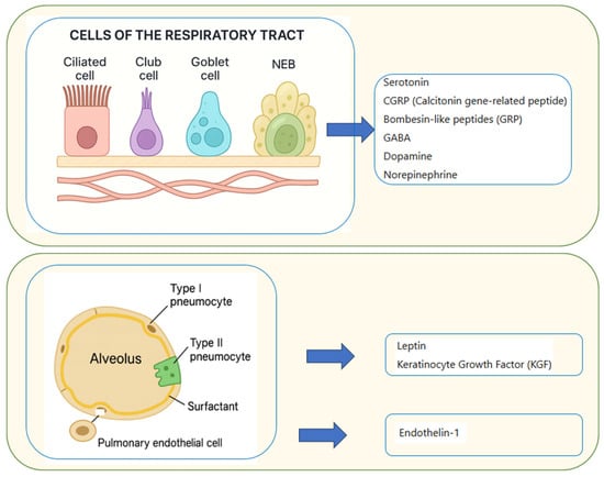 Schematic view of cells of the respiratory tract and alveolar epithelium function as active sources of endocrine and paracrine mediators. Pulmonary neuroendocrine cells (PNECs), a specialized subgroup of epithelial cells located mainly in the airway epithelium of large and small bronchi, occur either in isolation or as clusters termed neuroepithelial bodies (NEBs). These cells release serotonin, calcitonin gene-related peptide (CGRP), bombesin-like peptides (GRP), GABA, dopamine, and norepinephrine, thereby modulating ventilation, vascular tone, and immune responses [23,80,82,83]. In the alveolar compartment, type II pneumocytes secrete leptin and keratinocyte growth factor (KGF) [45,46], while pulmonary endothelial cells produce endothelin-1 [80], contributing to alveolar homeostasis, epithelial repair, and vascular regulation.