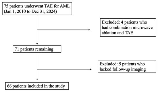 - Siasat, P.; Griffin, J.; Jhamb, A.; Lenaghan, D.; Florescu, C. Renal angiomyolipoma selective arterial embolization: Australian tertiary centre experience over 10 years. J. Med. Imaging Radiat. Oncol. 2024, 68, 577–585. [Google Scholar] [CrossRef] [PubMed]