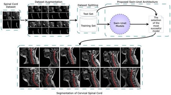 In this study, cervical spinal cord segmentation was performed with Swin-UNet, one of the transformer-based U-Net architectures, using sagittal T2-w MR images in the prepared dataset. All experiments were conducted on a computer system equipped with an Intel Core i5 4.10 GHz processor, 16 GB of DDR4 3000 MHz RAM, an NVIDIA RTX A4000 16 GB GPU, a 1 TB HDD, and a 500 GB SSD. MRI image analysis, manual segmentation, and generation of the ground truth (GT) mask were performed using ITK-SNAP 4.0 software. Model development, training, and evaluation were carried out in the Jupyter Notebook environment (v. 7.1.2) using Python language (v. 3.6.13) and the PyTorch (v. 2.0.0) deep learning library. Additionally, the Timm (PyTorch Image Models) library was used for ViT and other convolutional models. We trained and validated the segmentation models using cervical spinal cord MR images and the corresponding ground truth (GT) masks manually generated from the dataset.