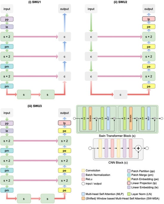 SWU3 in Figure 3iii represents a hybrid architecture that embeds swin transformer blocks in both the encoder and decoder paths. The encoder initiates with patch partitioning and linear embedding, followed by hierarchical Swin Transformer stages (s × 2), interleaved with patch merging. The decoder mirrors this structure with patch embedding and additional swin transformer stages, ensuring both global and local information is effectively captured and preserved throughout the network. This full integration of transformer blocks enables the model to learn rich feature representations while maintaining structural integrity via skip connections and layer normalization.