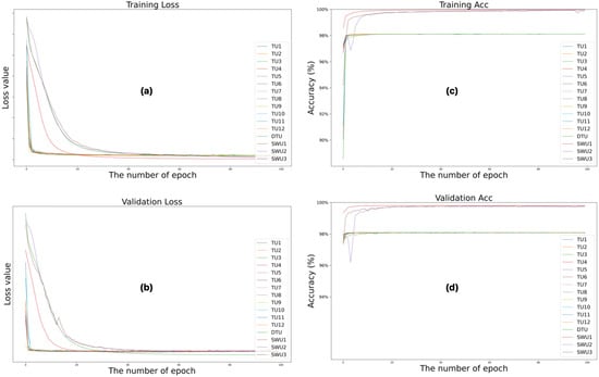 Figure 4 illustrates the changes in loss and accuracy values during the training and validation phases to quantitatively evaluate the training processes of the Swin-Unet and TransUNet deep learning models over 100 epochs. Figure 4a shows the training loss, Figure 4b shows the validation loss, Figure 4c shows the training accuracy, and Figure 4d shows the validation accuracy. These figures show the results of training the architectures. Analyzing the loss and accuracy values of the training and validation processes reveals that the Swin-Unet (SWU1, SWU2, and SWU3) architectures yield more successful results than the TransUNet (TU1–TU12 and DTU) variants. While all models exhibit a general downward trend in training loss over time, Swin-Unet-based models achieve lower loss values earlier and demonstrate a more stable learning process. The training accuracy data shows that Swin-Unet architectures stand out with accuracy rates above 99%, while some TransUNet models remain in the 96–98% range. Similarly, validation loss and accuracy metrics show that Swin-Unet architectures have lower validation loss and higher validation accuracy, indicating greater generalizability. These results suggest that Swin-Unet architectures perform more effectively and consistently in cervical spinal cord segmentation, particularly when data is limited.