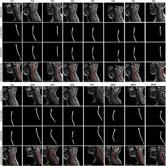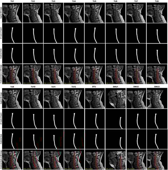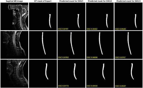 In this study, the publicly available dataset [56] proposed by Bédard and Cohen-Adad, which consists of isotropic T2-w 3D volumes, was used to evaluate the generalization ability of the proposed SWU1, SWU2, and SWU3 models for the automatic segmentation of the cervical spinal cord. For our experiments, sagittal planes were extracted from these isotropic 3D volumes and we conducted all experiments using the full 3D volumetric data to ensure methodological consistency. The results of the key metrics obtained from the experimental studies conducted to evaluate the performance of the SWU1, SWU2, and SWU3 models are shown in Table 3. Of the three variants, SWU1 had the highest accuracy, with a DSC of 0.9540, a PRE of 0.9497, and a REC of 0.9596. It also had the lowest error rates in distance-based (HD95 = 0.5627 mm) and volume-based (VOE = 0.0868) metrics. These results confirm the stability and robustness of SWU1 in delineating cervical spinal cord regions even under anatomical and contrast variability. In contrast, although SWU2 and SWU3 produced competitive PRE values (0.9253 and 0.9329, respectively), they showed lower DSC and REC scores and relatively higher HD95 and VOE values. This indicates weaker boundary consistency and spatial localization. Overall, the findings suggest that the encoder-enhanced SWU1 architecture effectively balances local detail preservation and global context modeling. This makes it the most clinically promising framework among the evaluated models. In Figure 8, segmentation results from the publicly available dataset are presented, comparing the expert-generated GT masks with the predicted masks obtained by the proposed SWU1, SWU2, and SWU3 models. The visual analysis reveals that the SWU1 model achieves highly accurate segmentation, closely matching the expert annotations, particularly in thin and curved regions of the cervical spinal cord, with DSC scores.
