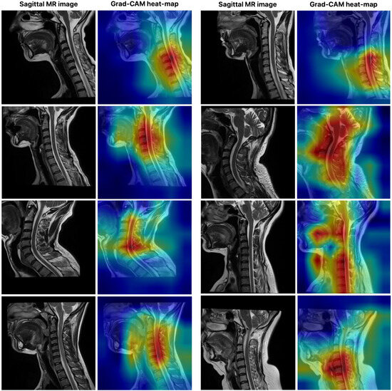 Figure 7 illustrates the visual explanation of the SWU1 model’s decision-making process using Gradient-weighted Class Activation Mapping (Grad-CAM), a commonly adopted interpretability technique for convolutional and transformer-based deep learning models. The left column in each pair shows the original sagittal MR image of the cervical spine, while the right column displays the corresponding Grad-CAM heat map overlaid on the image to highlight regions of the model’s attention during segmentation. In this study, Grad-CAM was applied to the SWU1 model, which integrates swin transformer blocks in the encoder and achieved the highest segmentation performance among all evaluated models. The goal of this visualization is to reveal the spatial focus of the network-that is, which areas of the input the model deems most relevant when delineating the cervical spinal cord. The red and yellow regions on the heat maps represent higher activation zones, indicating where the model is placing the most attention during feature extraction and decision-making. As observed from the visualizations, SWU1 consistently focuses on the central spinal cord region, even in cases with anatomical curvature, varying contrast, or adjacent vertebral structures. This suggests that the attention mechanisms within the swin transformer encoder are effectively learning to prioritize semantically meaningful regions despite the presence of surrounding complex anatomy and imaging noise. Furthermore, the attention maps demonstrate spatial consistency and anatomical relevance, validating that the model does not rely on irrelevant or artifact-prone areas.