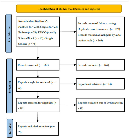 The database search resulted in a total of 530 articles. After filtering for articles published of sarcoidosis in humans in English, and removing duplicates, 261 articles remained to be screened. After reviewing the abstracts, 169 were excluded. The full text of the remaining 92 articles were retrieved for assessment of eligibility. Of those 92 articles, 14 were not retrieved, leaving 78 articles to be further evaluated according to our inclusion and exclusion criteria and to be critically appraised. Finally, a total of 59 articles were included in this systematic review following the search criteria (Figure 1).