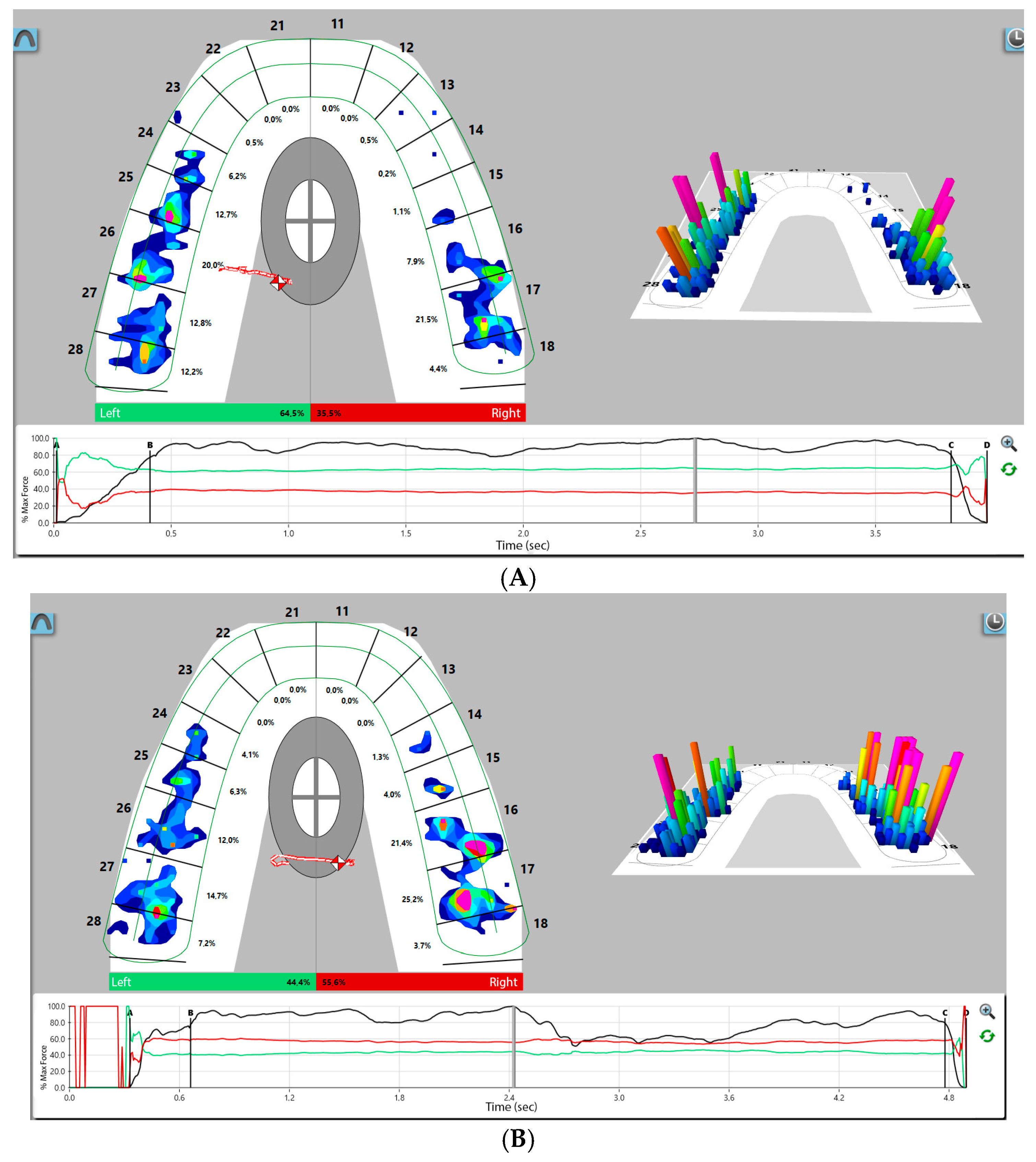 - Abutayyem, H.; Annamma, L.M.; Desai, V.B.; Alam, M.K. Evaluation of occlusal bite force distribution by T-Scan in orthodontic patients with different occlusal characteristics: A cross sectional-observational study. BMC Oral Health 2023, 23, 888. [Google Scholar] [CrossRef] [PubMed]
