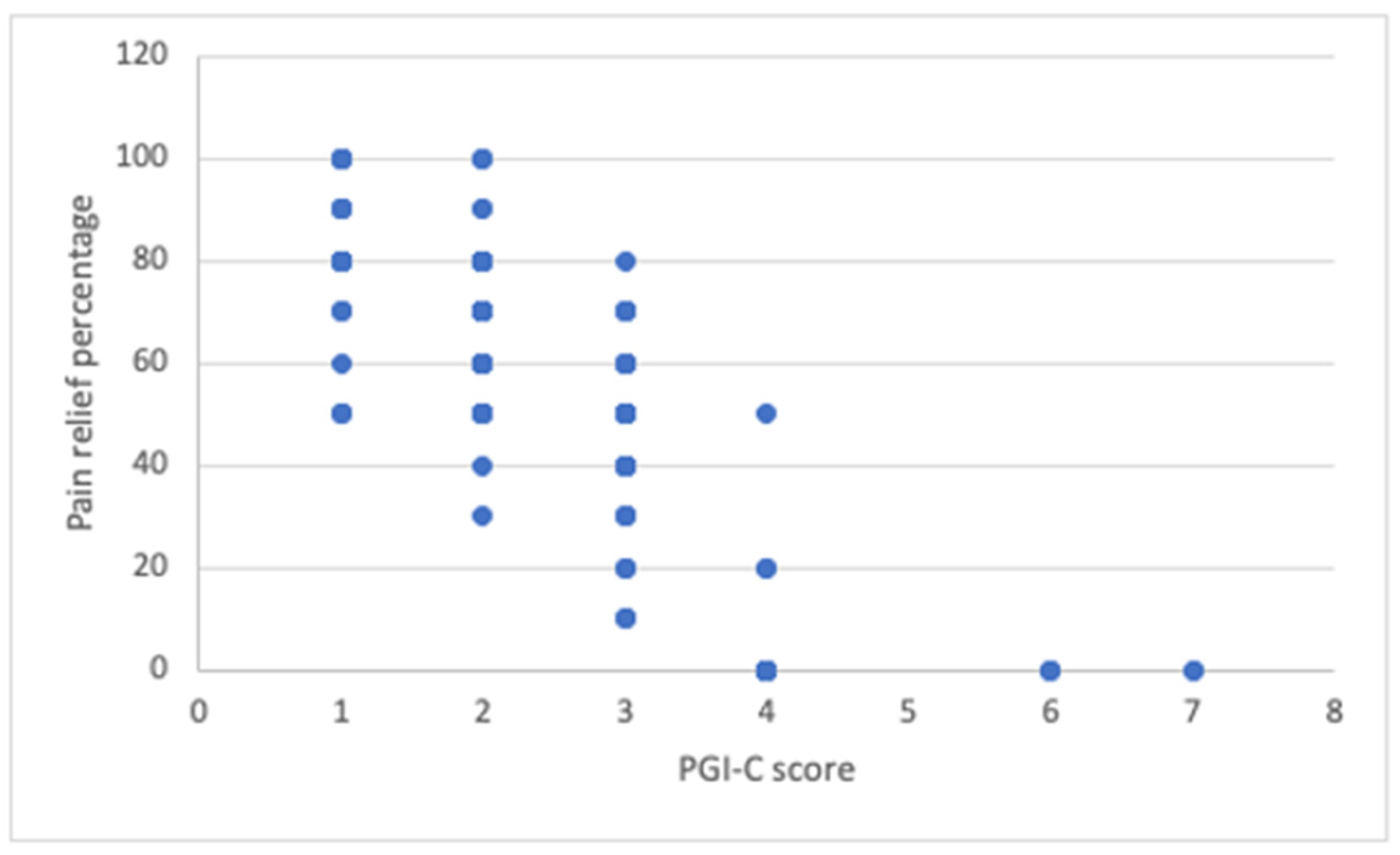 Pain relief percentage | 70 ± 30 | 45 ± 30 | 0.035 |