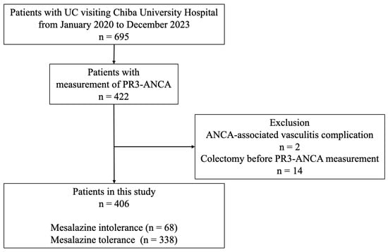 A total of 695 patients with UC visited Chiba University Hospital between January 2020 and December 2023. Of these, 422 patients had their serum PR3-ANCA levels measured at their first visit since January 2013. After excluding two patients with ANCA-associated vasculitis and 14 patients who had undergone colectomy before the measurement of serum PR3-ANCA levels, 406 patients were included in this study. Mesalazine intolerance was observed in 68 (17%) patients, whereas the remaining 338 (83%) patients were considered mesalazine-tolerant (Figure 1).