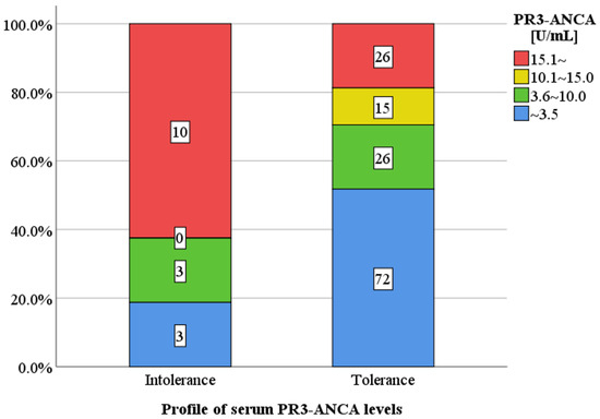The profile of serum PR3-ANCA levels for patients in the mesalazine intolerance and tolerance groups is shown (Figure 2). The proportion of patients with a markedly higher PR3-ANCA level (≥15.1 U/mL) was significantly higher in the intolerance group than in the tolerance group (63% vs. 19%, p < 0.001), whereas the proportion of patients with a normal PR3-ANCA level (≤3.5 U/mL) was significantly lower in the intolerance group than in the tolerance group (19% vs. 52%, p = 0.02).