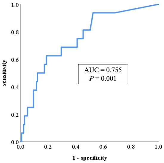 Using these cases and controls, the predictive potential of PR3-ANCA for mesalazine intolerance was determined by ROC curve analysis. The ROC curve analysis showed that the area under the curve (AUC) was 0.755 [95% confidence interval (CI): 0.634–0.876, p = 0.001]. The sensitivity and specificity to intolerance were 0.625 and 0.806, respectively, when the cutoff value of serum PR3-ANCA was 15.0 U/mL (Figure 3).