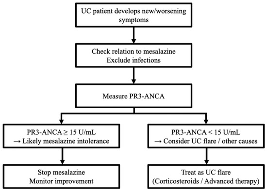 The flowchart regarding a recommended decision-making pathway integrating PR3-ANCA measurement. PR3-ANCA: protease 3 antineutrophil cytoplasmic antibody; UC: ulcerative colitis.