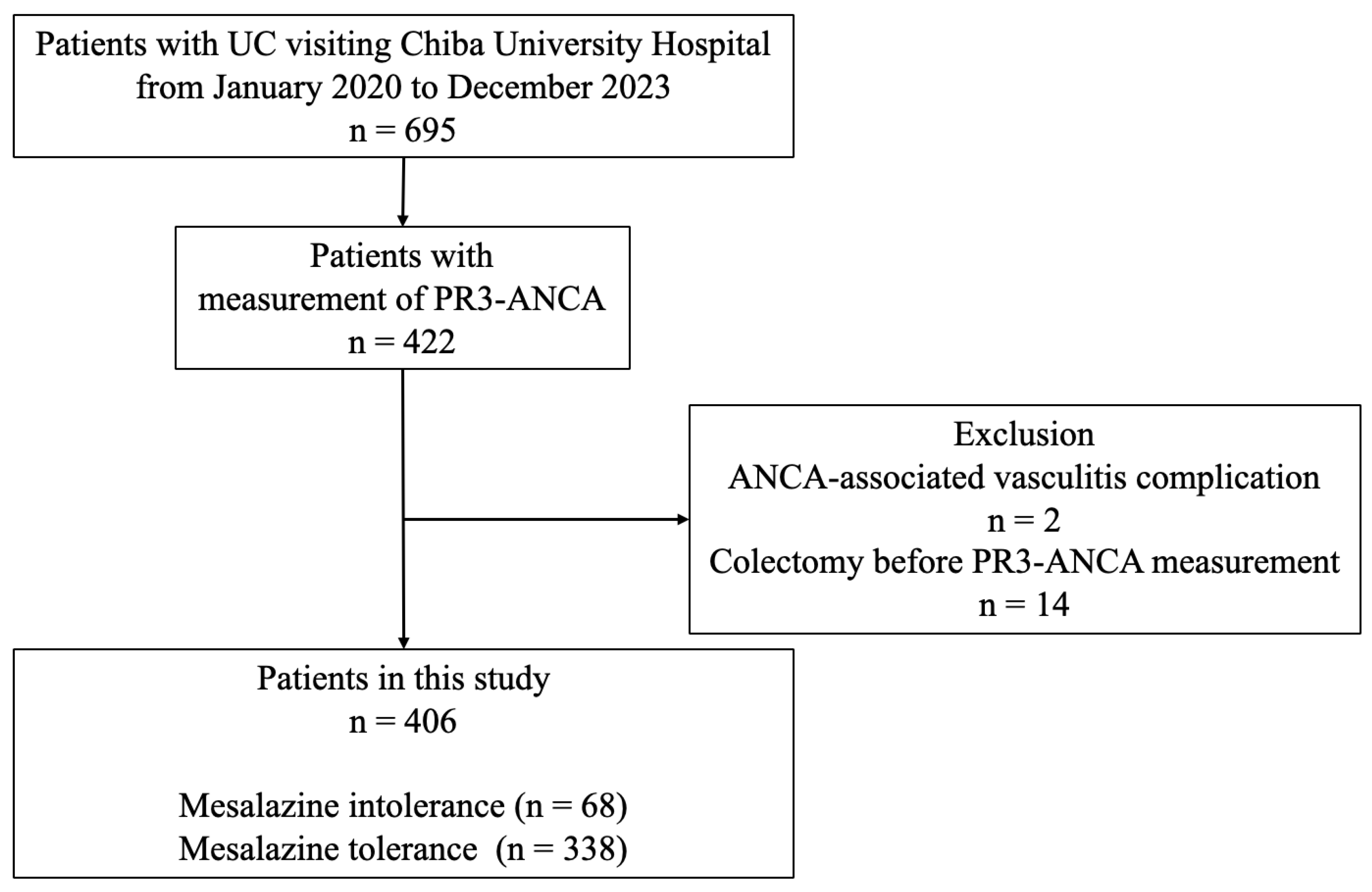 APA StyleOyama, Y., Taida, T., Matsubara, Y., Ozaki, T., Ohashi, T., Ito, T., Mukai, S., Shu, N., Koshibu, Y., Ozeki, Y., Furuya, M., Mamiya, Y., Nakazawa, H., Horio, R., Goto, C., Takahashi, S., Kurosugi, A., Sonoda, M., Kaneko, T., ... Kato, J. (2025). Elevated Serum Protease 3 Antineutrophil Cytoplasmic Antibody in Mesalazine-Intolerant Ulcerative Colitis: A Potential Diagnostic Biomarker. Journal of Clinical Medicine, 14(19), 7019. https://doi.org/10.3390/jcm14197019