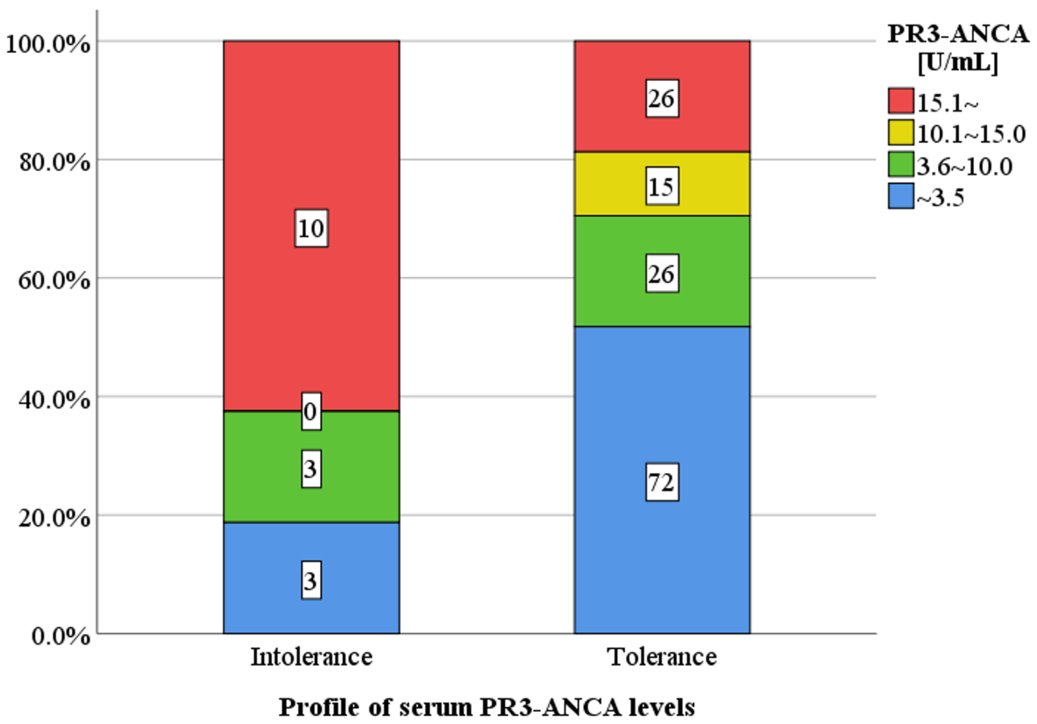 3.3. Serum PR3-ANCA Levels in Clinically Active Patients Between the Mesalazine Intolerance and Tolerance Groups