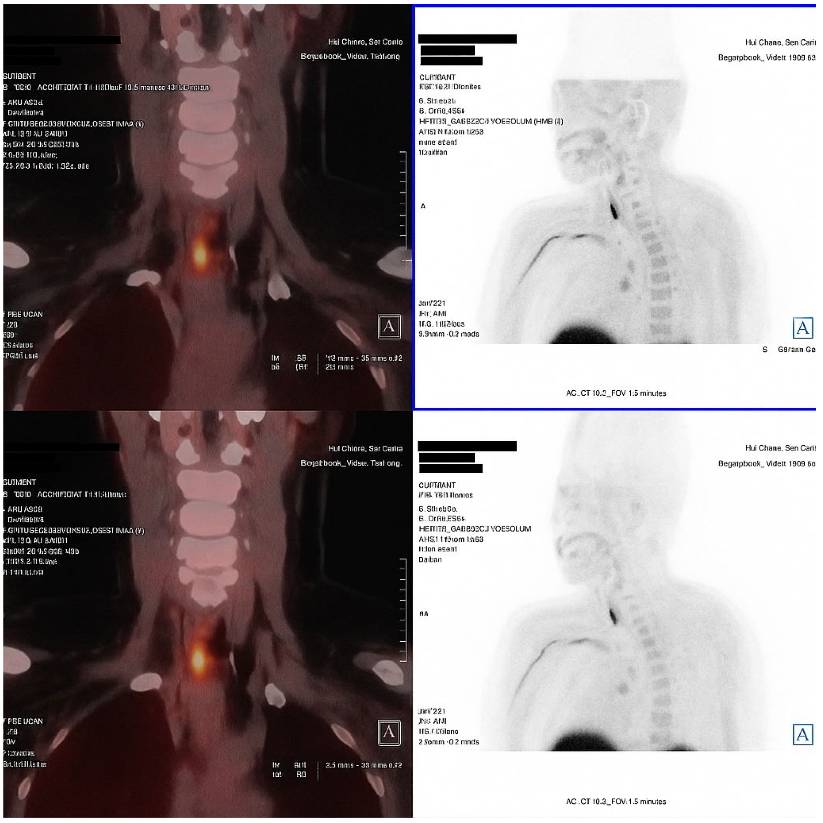 An 18F-fluorocholine PET-CT (18F-choline PET-CT) scan performed in November 2024 identified two right parathyroid adenomas, located in the upper and lower poles. The patient did not report renal colic, falls or new fractures. At the most recent follow-up, a diagnosis of PHPT was confirmed, characterized by hypercalcemia, persistent hypophosphatemia, elevated PTH and FGF-23 levels and absence of hypercalciuria or overt hyperphosphaturia.