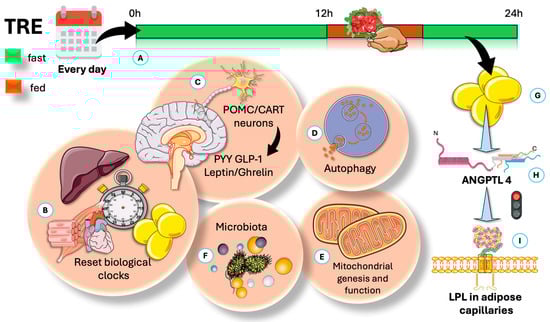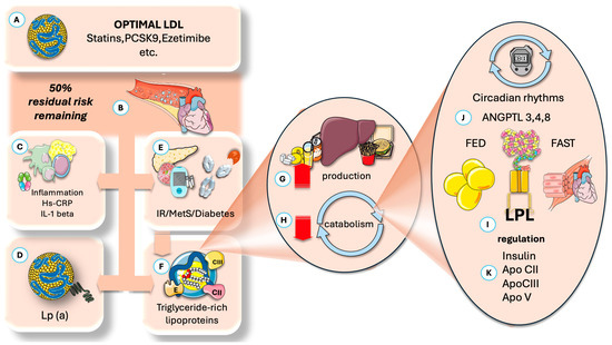 Time-restricted eating (TRE) represents one such promising dietary intervention that employs circadian rhythms to enhance metabolic health and facilitate weight management residual risk [14,15,16,17]. The advantages of TRE extend beyond mere weight loss; this approach also positively influences glucose homeostasis and insulin kinetics, blood pressure, and lipid profiles through processes such as circadian alignment and metabolic switching [14,18,19,20,21,22]. Consequently, there is considerable scientific interest in TRE as a potential strategy to address RCR. Emerging research indicates that TRE reduces circulating TRL and remnants, which are key atherogenic particles [23,24,25]. The underlying mechanisms we will focus on include the favorable modulation of lipoprotein lipase (LPL) activity, orchestrated by the regulation of ANGPTL 3, 4, and 8 during fasting periods.