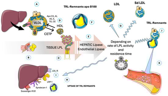 Overview of fasting TRL intravascular catabolism and potential production of atherogenic remnants. (A) Liver produces VLDL, which is catabolized mainly by (B) muscle in the fasting state. VLDL carries (among others) apoB100, apoE (critical for reuptake of its remnants), apo CII, and apoCIII (activator and inhibitor or LPL, respectively). (C) Lipoprotein lipase (LPL) releases FA for tissue oxidation, thereby reducing VLDL size. The whole process is regulated by activators and exchanges of lipid and apolipoproteins with HDL. (D). The importance of cholesteryl-ester transfer protein (CETP) is underlined. Smaller size VLDLs are then acted upon by hepatic and endothelial lipases (E) in a delicate balance that produces LDL or small–dense LDL (G) and, depending on residence time (balanced or imbalanced actions of apoE, CII, and CIII), may produce atherogenic TRL remnants (F and J) that are either captured by the liver (H) through several specific receptors (I) or may linger to enter subintima in arteries and result in atherogenesis (K). CII: apoCII; CIII: apoCIII; E: apoE; CETP: cholesteryl-ester transfer protein; sd-LDL: small–dense LDL; LDL-R: LDL receptor; LRP-1: LDL-receptor like protein 1; VLDL: very low-density lipoproteins. The Figure was partly generated using Servier Medical Art, provided by Servier, licensed under a Creative Commons Attribution 3.0 unported license.