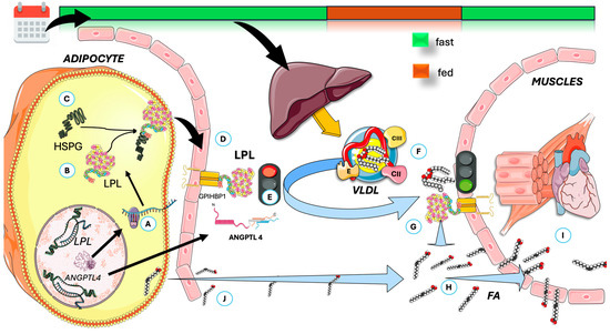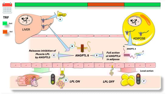 As previously briefly introduced in Figure 1, LPL activity is regulated in fed and fasted states by specific angiopoietin-like proteins (ANGPTL): ANGPTL3, ANGPTL4, and ANGPTL8, with the latter serving as a principal modulator. Accordingly, the subsequent sections will review the key aspects of time-restricted eating (TRE), followed by an overview of LPL and its primary regulators. We propose, and we will articulate the supporting arguments, that one of the central mechanisms underlying the cardiovascular and weight-related benefits of TRE involves its effects on the circadian rhythm of ANGPTL4 activity in adipose tissue, as well as its optimization of VLDL catabolism by muscle, potentially potentiated by reduced ANGPTL8 levels [51,52,53,54,55,56,57,58].