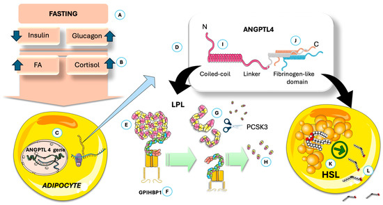 ANGPTL 4 impairs adipose uptake of FA and increases their release from the stores. (A) Fasting via its (B) hormonal and metabolic milieu, induces ANGPTL4 expression by adipocytes (C). (D) ANGPTL 4 schematic structure. By its action on LPL, (E) it promotes dissociation from GPIHBP1 (F); this dissociation (G) facilitates the action of PCSK3 (H) and proteolysis. These actions depend on an intact C-terminal (I). The fibrinogen-like domain (J) activates adipocyte HSL (K) promoting release of FA (L). ANGPTL4: angiopoietin-like protein 4; GPIHBP1: Glycosylphosphatidylinositol-anchored high-density lipoprotein binding protein 1; HSL: hormone-sensitive lipase; LPL: lipoprotein lipase; PCSK3: proprotein convertase subtilisin/kexin type 3. The Figure was partly generated using Servier Medical Art, provided by Servier, licensed under a Creative Commons Attribution 3.0 unported license.
