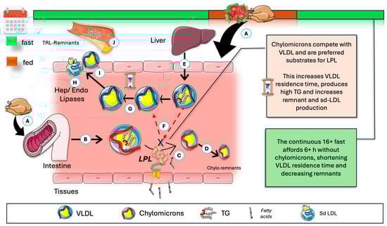A corollary to the above contention is a critical concept with significant pathophysiological implications, which is depicted in Figure 7: the rise in postprandial VLDL may be attributed to competition for the limited availability of lipoprotein lipase (LPL), with larger CM being the preferred substrate [8,148,157,158,159,160,161,162,163]. This competitive interaction explains the strong correlation observed between fasting plasma triglyceride concentrations and the extent of alimentary lipemia following fat consumption. When CM are present, VLDL catabolism is impaired. The frequency and duration of feeding consequently result in intermittent periods of reduced VLDL metabolism by LPL. Referring to Figure 2, VLDL particles with a prolonged residence time become substrates for hepatic lipase (HL) and endothelial lipase, thereby generating small dense LDL and other atherogenic remnants. TRE limits these effects to a much shorter period daily.
