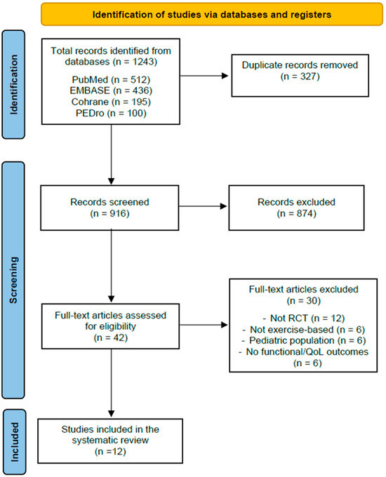 The database search yielded 1243 records (PubMed = 512, EMBASE = 436, Cochrane = 195, PEDro = 100). After removal of 327 duplicates, 916 records remained for screening. Following title and abstract screening, 874 articles were excluded because they did not meet inclusion criteria (reviews, observational studies, acute exercise protocols, non-SLE populations, or irrelevant outcomes).