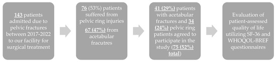 The study included patients operated on due to an acetabular fracture or pelvic injury in our center in the years 2017–2022. We had implemented the following inclusion criteria: acetabular fracture or pelvic ring injury treated operatively, operative treatment in our facility between 2017 and 2022. Acetabulum fractures were classified according to the Judet and Letournel classification (anterior column with posterior hemi-transverse fracture (AT), anterior column (AC), both columns (BC), posterior column (PC), posterior column + posterior wall (PC + W), posterior wall (PW), transverse (T), transverse with posterior wall fracture(T + P)). Pelvic ring injuries were classified according to the Young and Burgess system (anteroposterior compression (APC), lateral compression (LC), vertical shear (VS), and combined mechanisms (CMs)). Exclusion criteria: conservative treatment of acetabular fracture or pelvic injury. Interviews were conducted by two medical doctors from our facility in August 2024. Patients completed the surveys via telephone. Scheme 1 represents the enrollment process.