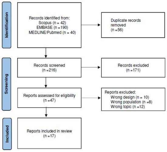 A total of 216 non-duplicated articles were identified. After excluding 172 articles based on the title/abstract, 45 potentially eligible full-text articles were reviewed. Of these, 30 were excluded due to different design (n = 10), topic (n = 12), or study population (n = 8). Two more records were identified via hand-search [21,26]. Finally, 17 articles were included in the synthesis [10,11,12,13,14,15,16,17,18,19,20,21,22,23,24,25,26]. The PRISMA flow-chart is shown in Figure 1.