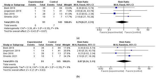 (a,b). Pooled analyses. (a) OR and (b) RR of local recurrence rate among included studies [23,24,25,26] that compare negative pressure therapy to conventional dressings.