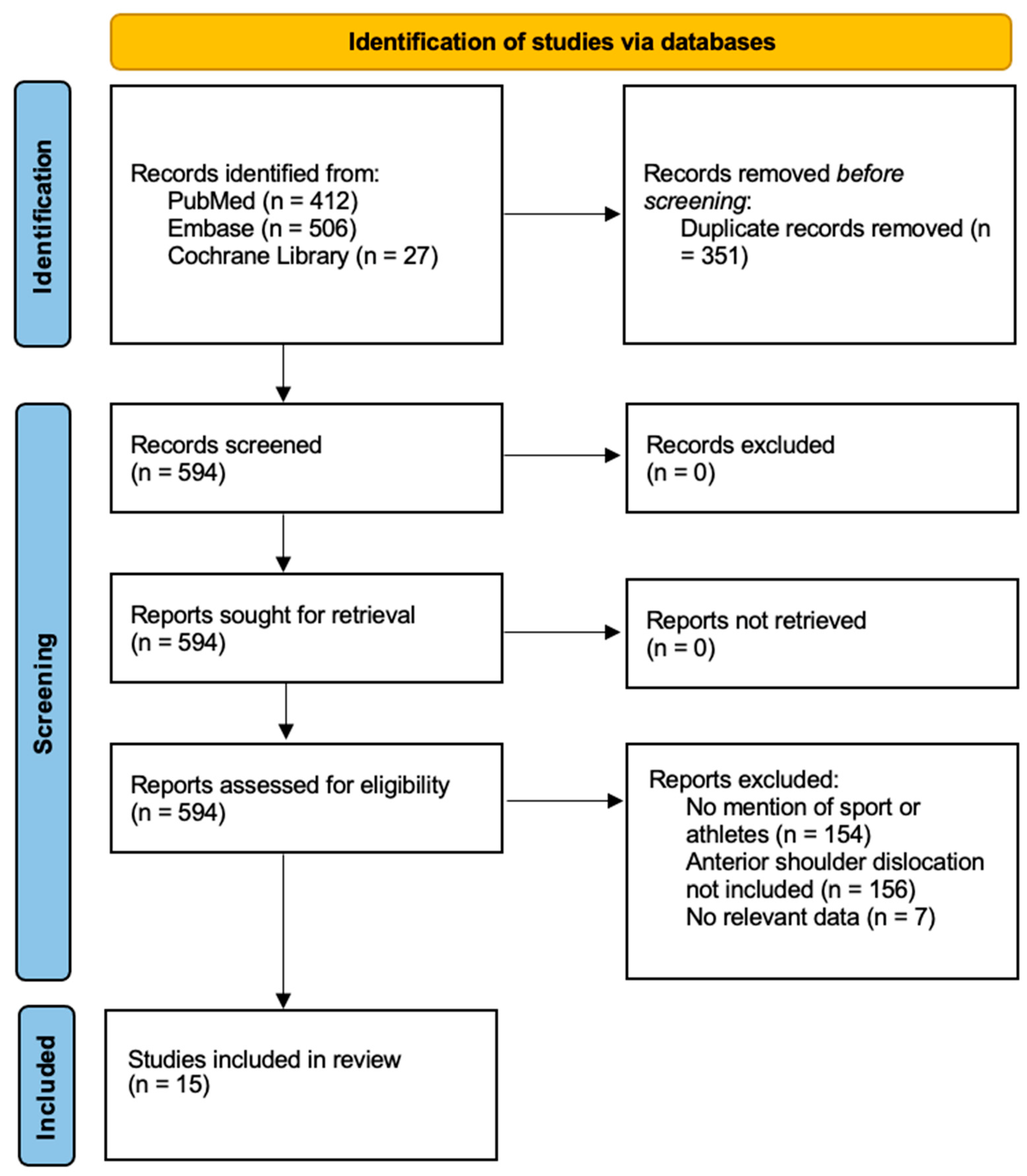 19 | (“Shoulder Dislocation”[MeSH Terms] OR “Bankart Lesions”[MeSH Terms] OR ((“Joint Instability”[MeSH Terms] OR “Athletic Injuries”[MeSH Terms]) AND (“shoulder”[Title/Abstract] OR “glenohum*”[Title/Abstract] OR “gleno hum*”[Title/Abstract] OR “labrum”[Title/Abstract])) OR ((“shoulder”[Title/Abstract] OR “glenohum*”[Title/Abstract] OR “gleno hum*”[Title/Abstract] OR “labrum”[Title/Abstract]) AND (“[18]nstability*”[Title/Abstract] OR “dislocation*”[Title/Abstract] OR “subluxation*”[Title/Abstract] OR “luxation*”[Title/Abstract])) OR (“bankart lesion*”[Title/Abstract] OR “bankart fracture*”[Title/Abstract])) AND “anterior”[Title/Abstract] AND (“shoulder joint/surgery”[MeSH Terms] OR “Orthopedics”[MeSH Terms] OR “surgical procedures, operative”[MeSH Terms] OR “Conservative Treatment”[MeSH Terms] OR (“operat*”[Title/Abstract] OR “surger*”[Title/Abstract] OR “surgic*”[Title/Abstract] OR “bankart repair*”[Title/Abstract] OR “bankart procedure*”[Title/Abstract] OR “latarjet bristow*”[Title/Abstract] OR “conservative”[Title/Abstract] OR “immobilis*”[Title/Abstract] OR “immobiliz*”[Title/Abstract] OR “collar and cuff”[Title/Abstract] OR “collarandcuff”[Title/Abstract] OR “non surg*”[Title/Abstract] OR “nonsurg*”[Title/Abstract] OR “non operat*”[Title/Abstract] OR “nonoperat*”[Title/Abstract])) AND (“Athletes”[MeSH Terms] OR “Sports”[MeSH Terms] OR “Athletic Injuries”[MeSH Terms] OR (“athlete*”[Title/Abstract] OR “sport*”[Title/Abstract] OR “competition*”[Title/Abstract] OR “play”[Title/Abstract] OR “collision*”[Title/Abstract])) AND (“[18]nstabi”[Language] OR “[18]nstab”[Language]) AND 2013/01/01:2023/12/31[Date – Publication] | “Outcome” block left out 652 |