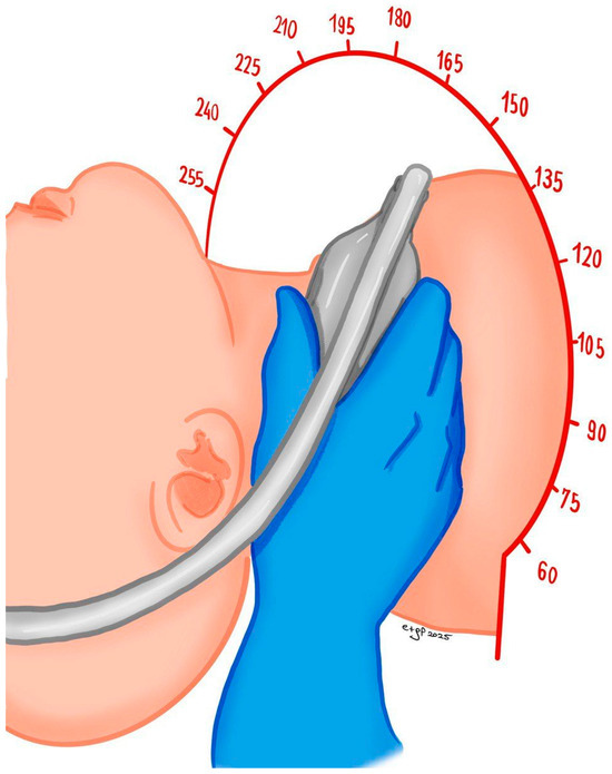 The patient should be positioned supine with their head and shoulders resting on a pillow, and their head should be turned slightly away from the side being examined. We recommend that the operator sit behind the patient, with their scanning arm resting on the patient’s bed and the opposite arm operating the ultrasound system (Figure 1).