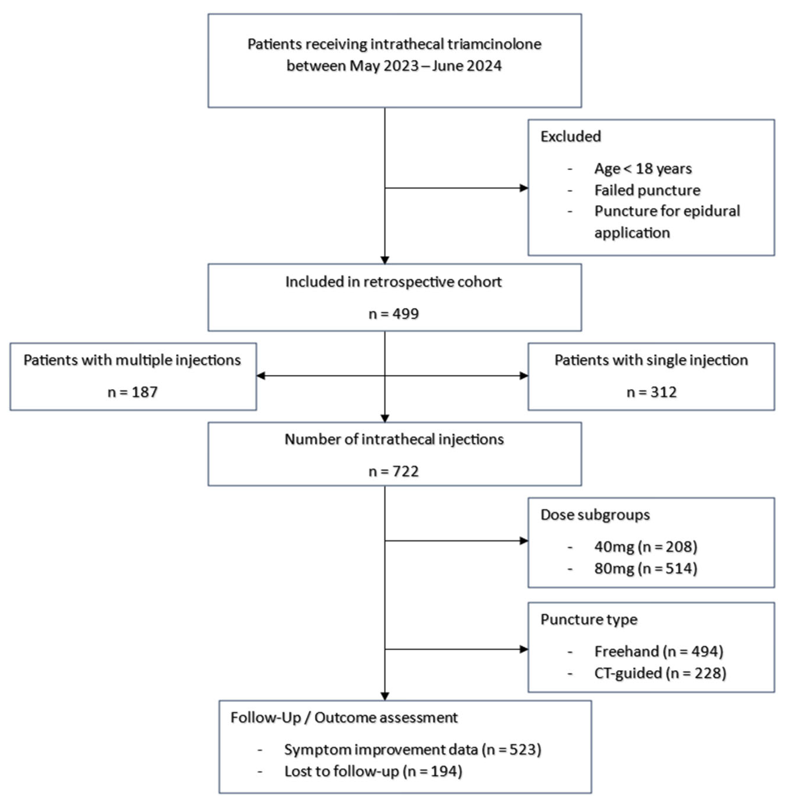 Study design: This retrospective study included patients who received the intrathecal administration of triamcinolone acetonide for the treatment of lumbar degenerative spinal diseases at our department between May 2023 and June 2024. Inclusion criteria were an intrathecal administration of triamcinolone acetonide (Volon A; Dermapharm GmbH, Vienna, Austria) for lumbar degenerative spinal disease via lumbar puncture between May 2023 and June 2024. Exclusion criteria were age under 18 years, failed puncture, and punctures for epidural application of triamcinolone acetonide. A STROBE flow diagram was created to illustrate the selection process of the study population, including inclusion and exclusion criteria (see