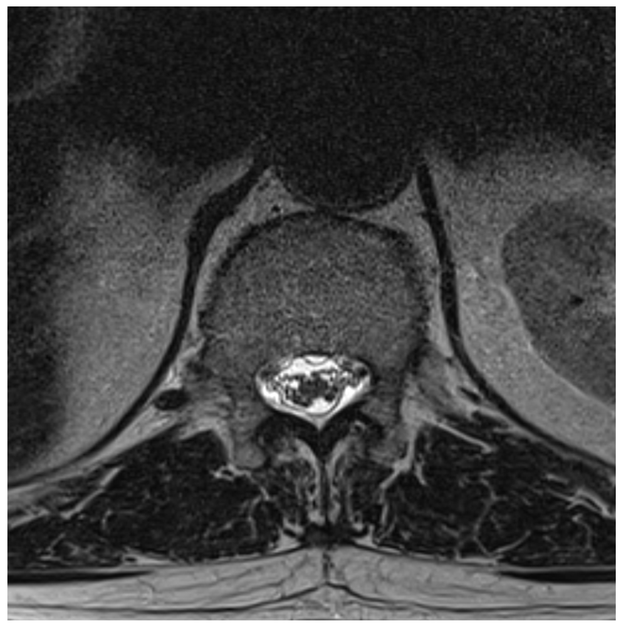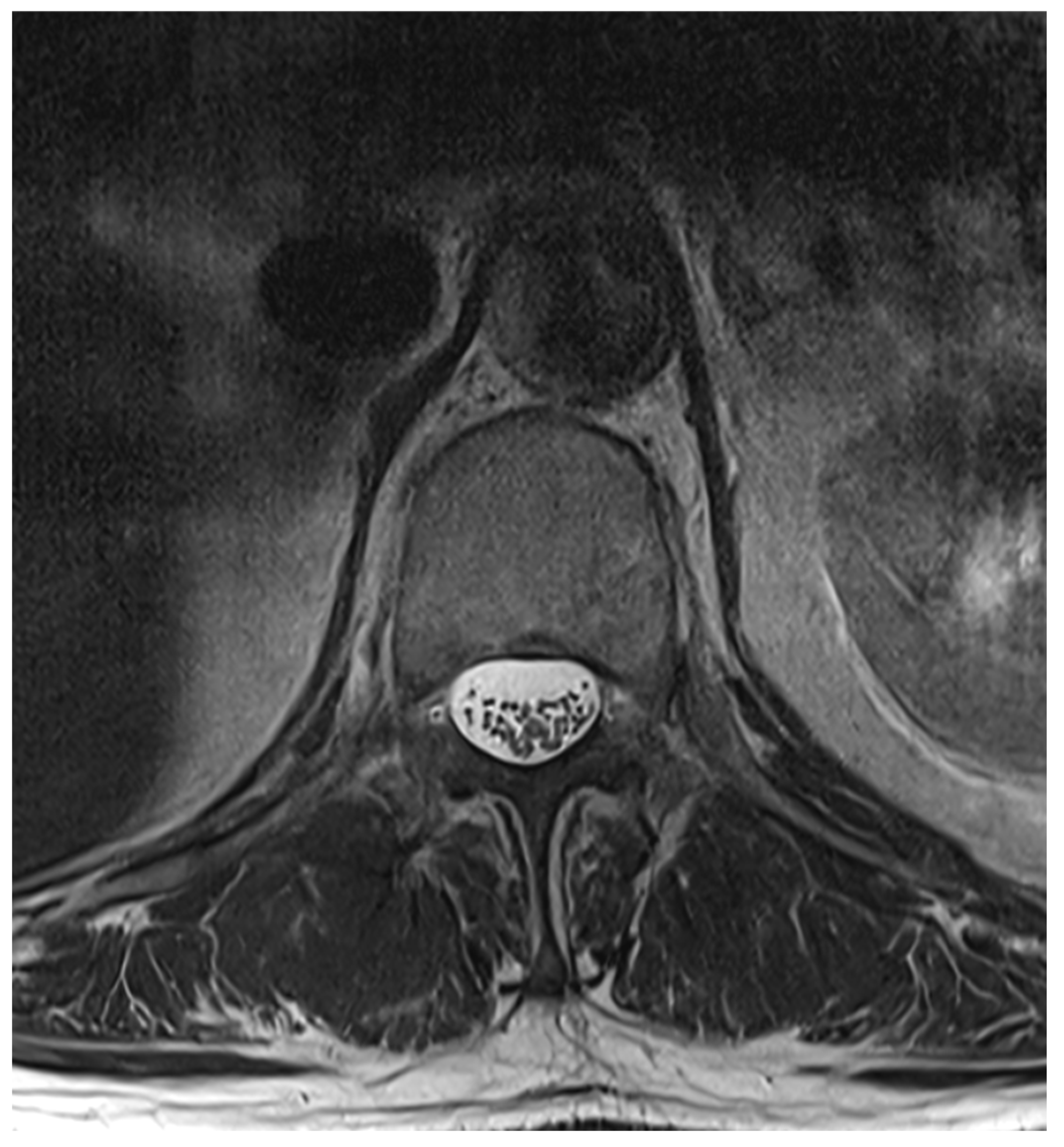 Figure 2. No neurological deficits occurred, but due to persistent headache, an MRI scan was performed which revealed the diagnosis. The patient was readmitted for inpatient treatment for another 5 days 1 month after initial puncture. An MRI scan of the lumbar scan revealed epidural accumulations of cerebrospinal fluid at the thoracolumbar junction (