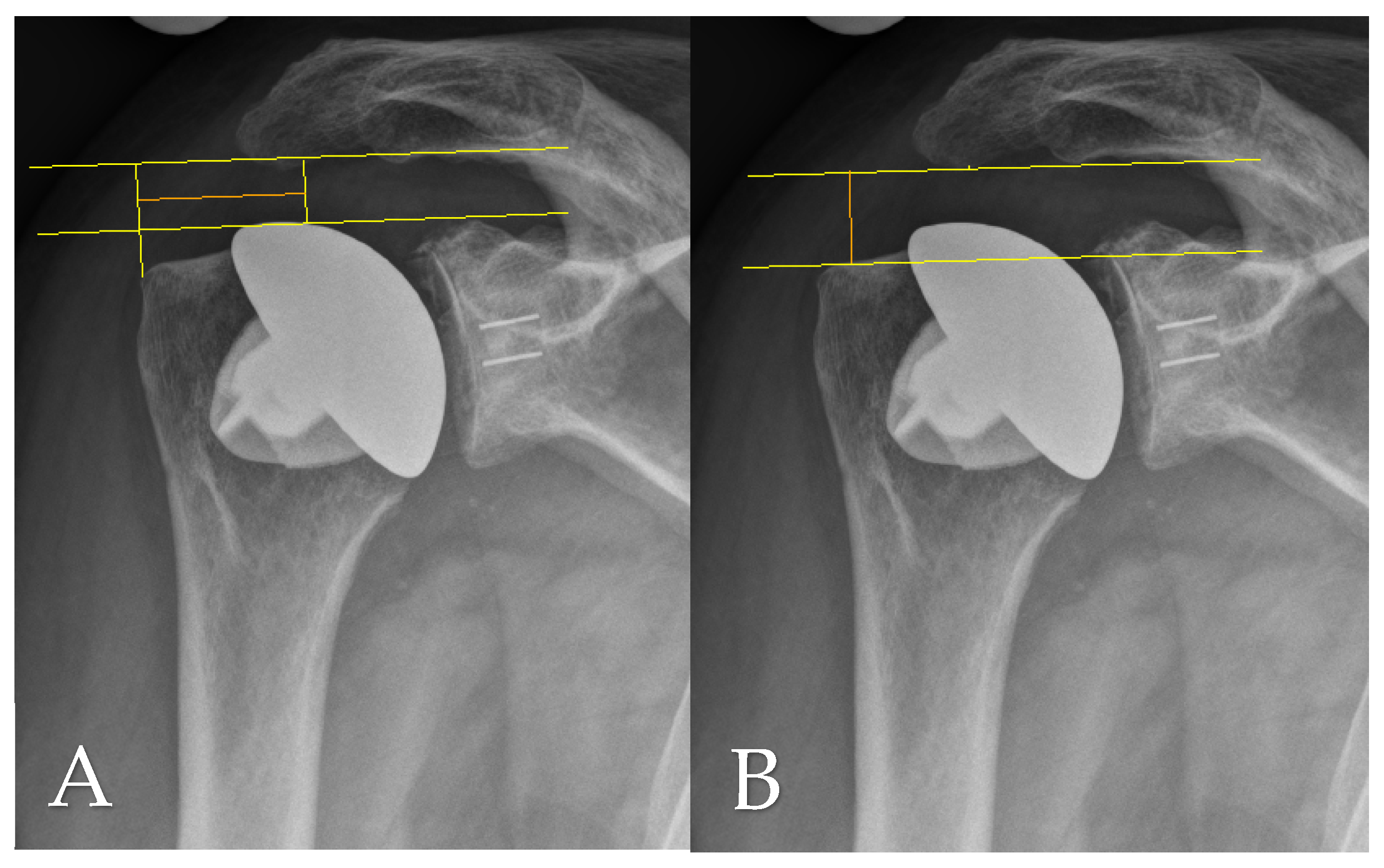 - Duey, A.H.; Dieterich, J.D.; Patel, A.V.; White, C.A.; Cirino, C.M.; Li, T.; Galatz, L.M.; Parsons, B.O.; Flatow, E.L.; Cagle, P.J. Superior migration of the humeral head does not significantly affect outcomes at an average of 11 years after total shoulder arthroplasty. J. Shoulder Elb. Surg. 2023, 32, 2493–2500. [Google Scholar] [CrossRef]