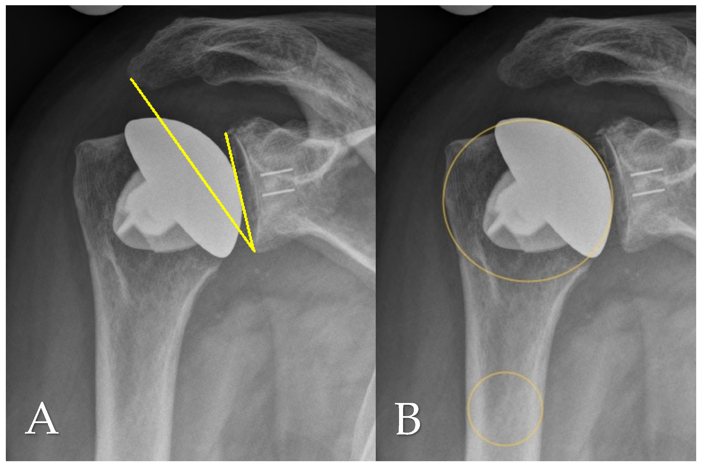 - Streck, L.E.; Gaal, C.; Gohlke, F.; Rudert, M.; List, K. Does radiolucency really predict loose components in revision shoulder arthroplasty? Skelet. Radiol. 2023, 52, 1759–1765. [Google Scholar] [CrossRef] [PubMed]